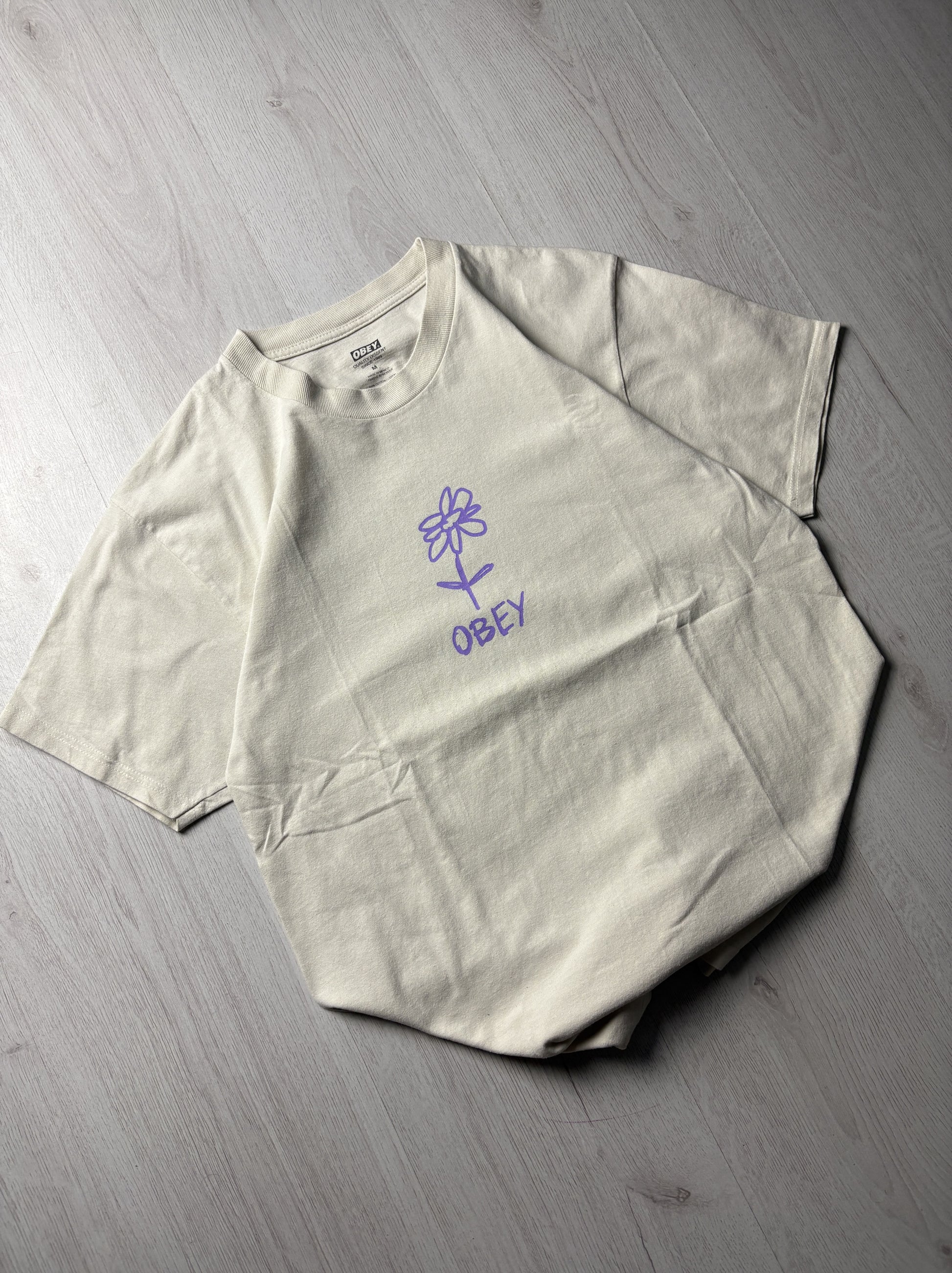 Gebroken wit Obey T-shirt met een subtiele maar opvallende paarse bloemprint op de voorkant. Gemaakt van stevig katoen met een comfortabele pasvorm en zachte feel. Dit item is in uitstekende staat (9/10), licht gedragen maar zonder zichtbare beschadigingen. Maat Medium.