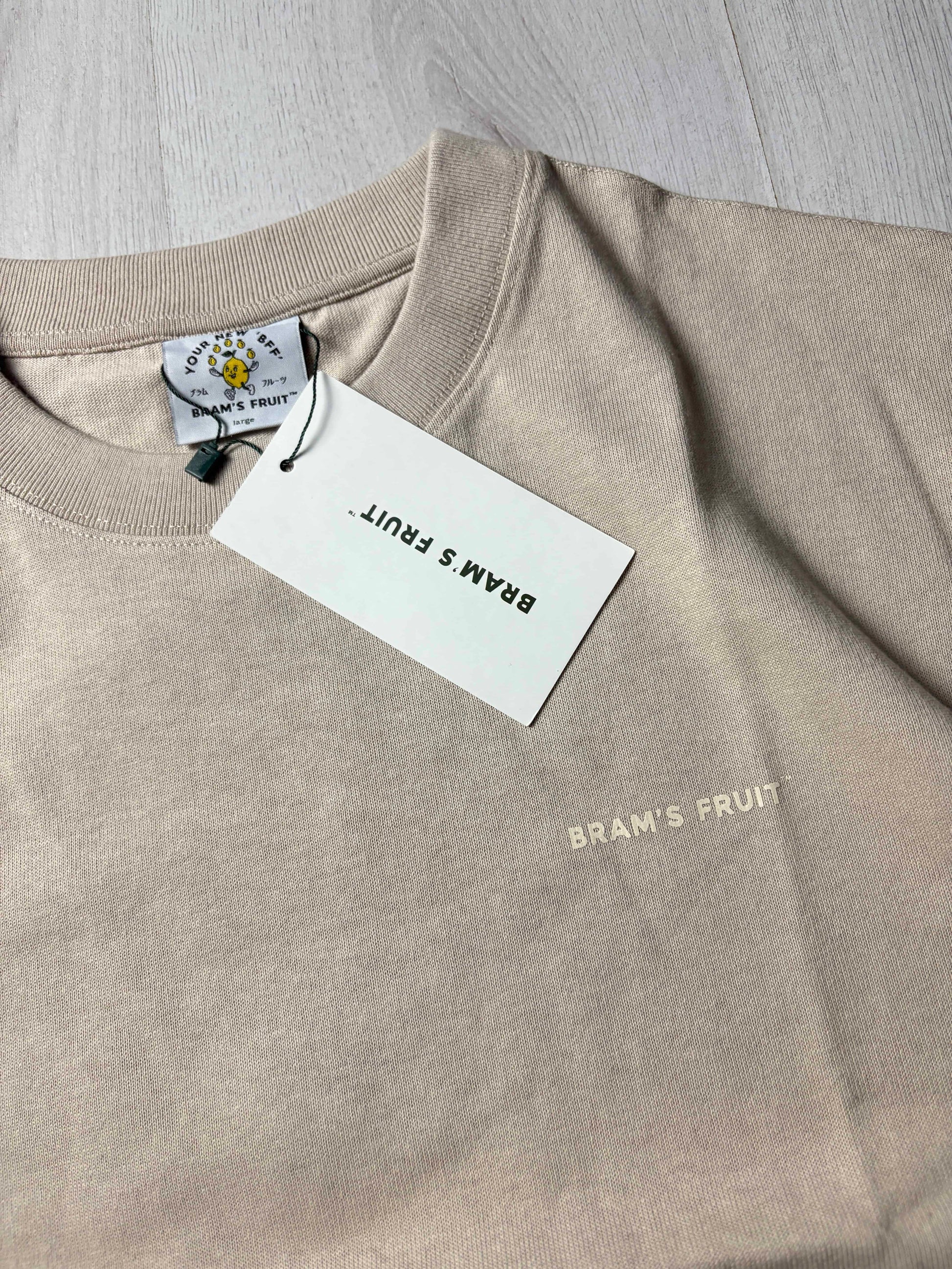 Statement T-shirt van Brams Fruit in khaki met opvallende βBig Lemonβ print op de achterkant. Gloednieuw met originele prijskaartjes, in maat L. Het shirt heeft een relaxed fit en is gemaakt van stevig katoen met een premium feel. De subtiele voorkant in combinatie met de opvallende rugprint maakt dit een echte eyecatcher binnen je outfit.