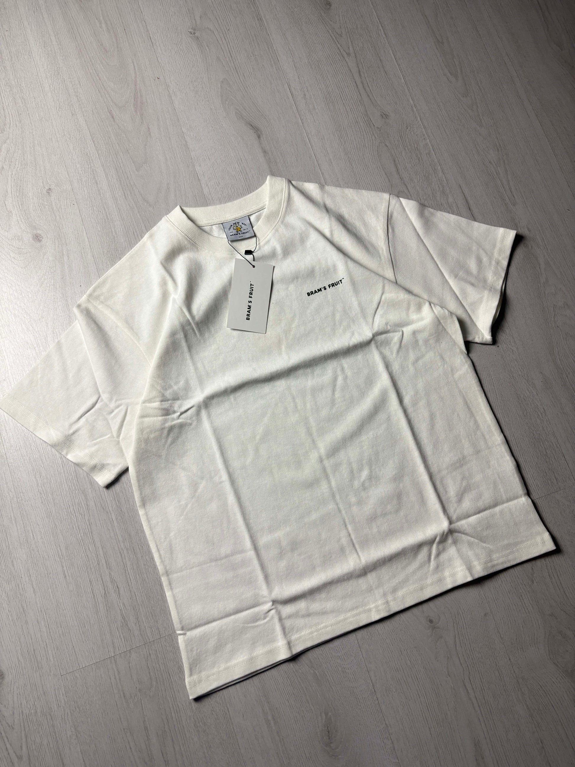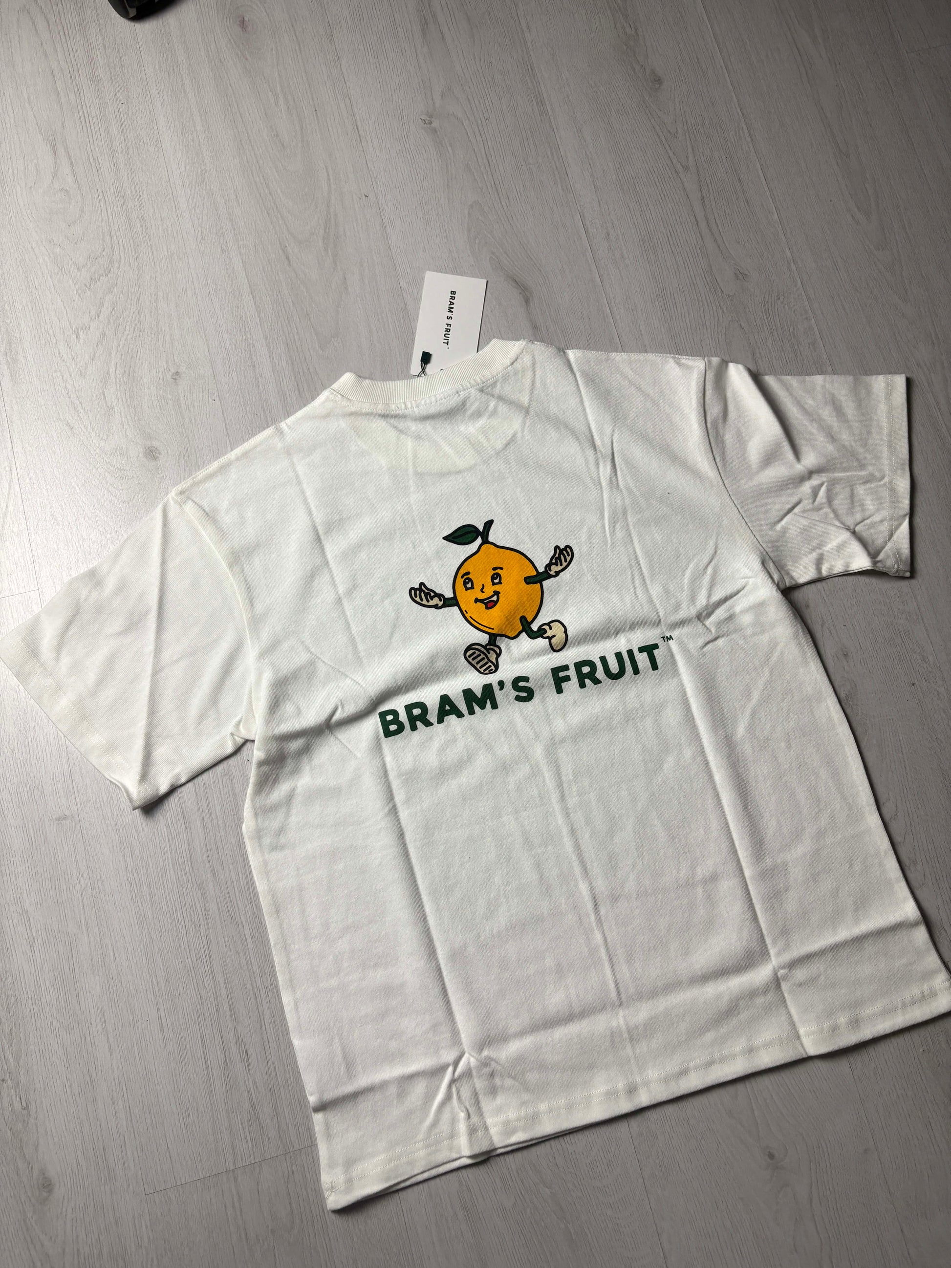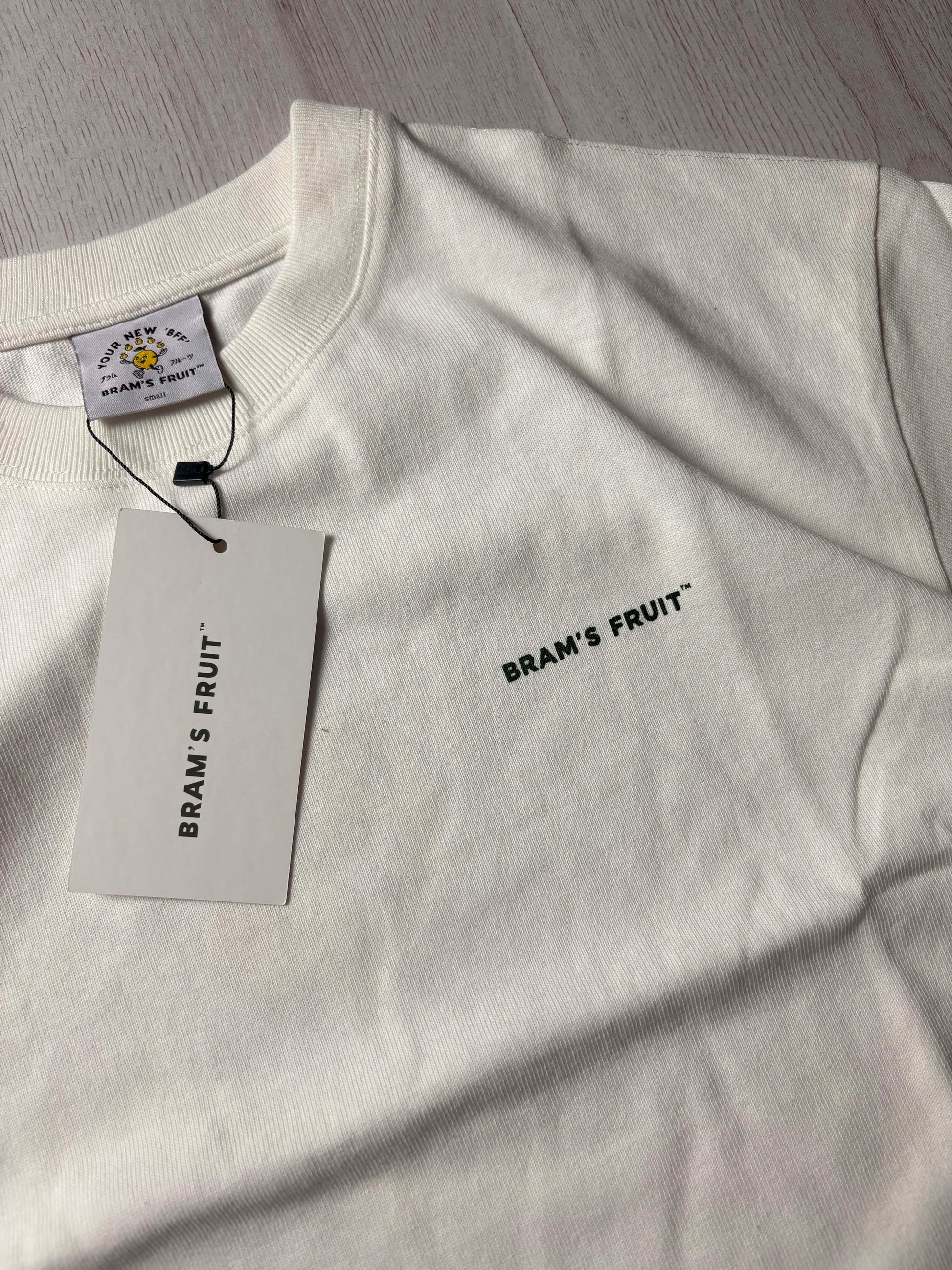 Wit Brams Fruit T-shirt met de opvallende βBig Lemonβ graphic op de achterkant. Dit item is volledig nieuw met originele prijskaartjes en beschikbaar in meerdere maten. Gemaakt van stevig katoen en voorzien van een relaxed fit, zoals je gewend bent van Brams Fruit: minimalistische voorkant, verrassende achterkant.