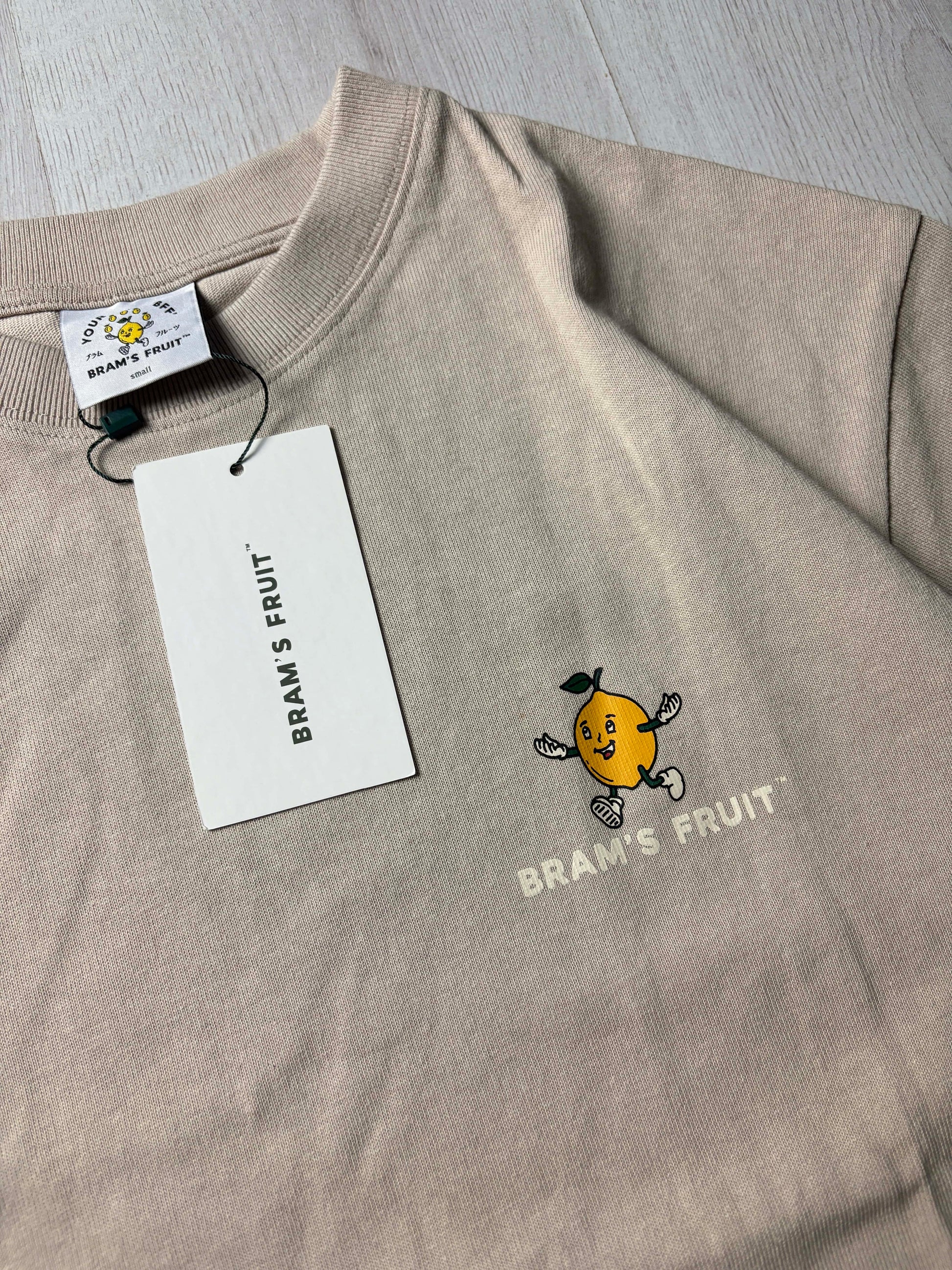 Khaki Brams Fruit T-shirt met minimalistische citroenprint op de borst. Een fris en clean design uit hun herkenbare collectie, gemaakt van zwaar katoen met een comfortabele, relaxte fit. Het shirt is gloednieuw, inclusief originele prijskaartjes, en beschikbaar in meerdere maten.